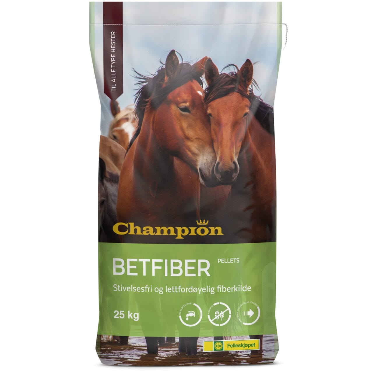 Champion Betfiber 25 kg er et fiberrikt fôrtillskudd til hest som kombinerer energiinnholdet til kraftfôr med fibrenes fordøyelsesfordeler. Produktet er utviklet for å gi hesten et fiberrikt alternativ som oppfører seg som grovfôr i fordøyelsessystemet, samtidig som det gir jevn energitilførsel uten stivelse. Champion Betfiber er helt stivelsesfritt og inneholder lettfordøyelige superfibre som bidrar til væskebinding i fordøyelseskanalen, noe som gir et væskereservoar som støtter fordøyelsen.