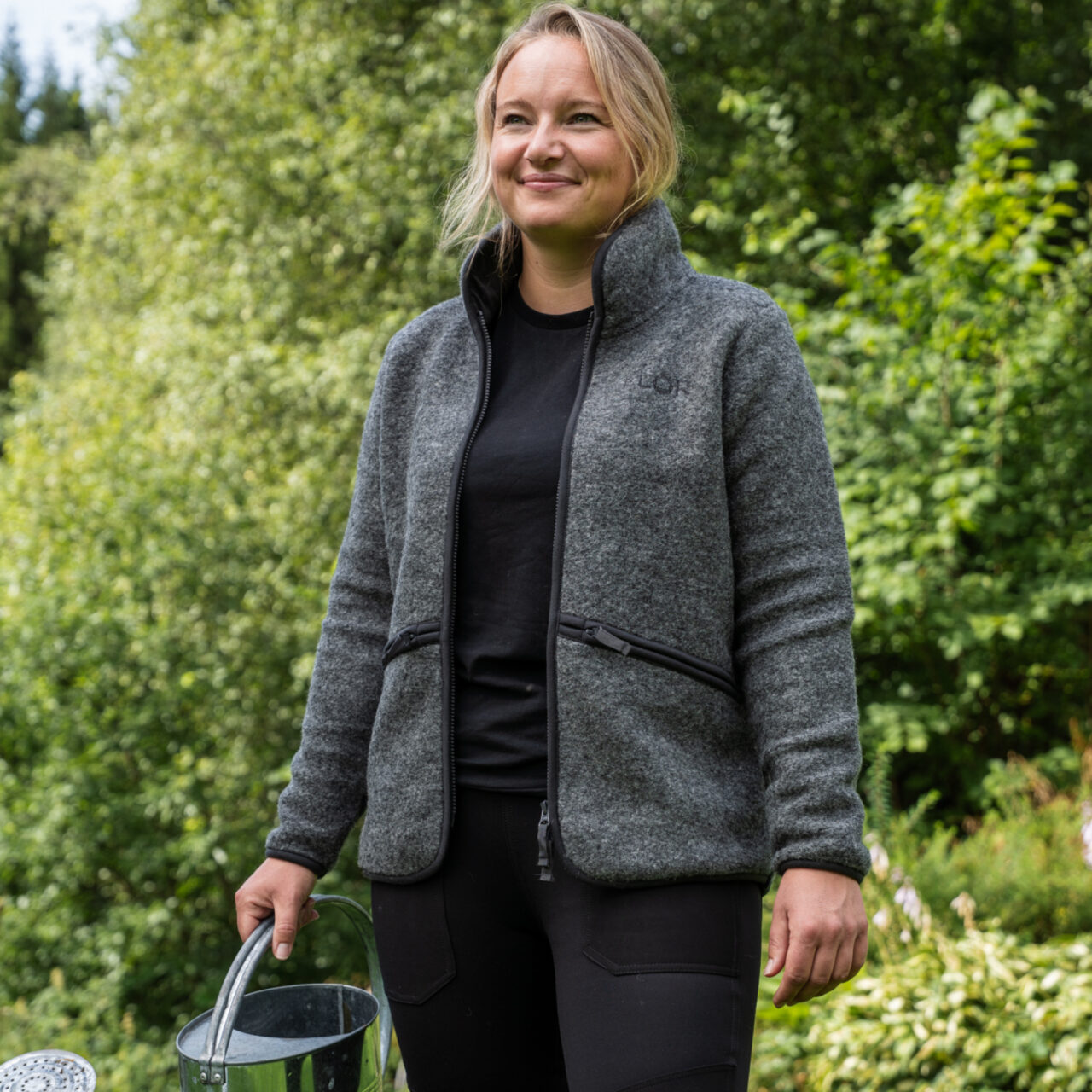 Jakken har en høy krage som beskytter mot kald trekk, og sidelommer med glidelås som er perfekte for å sikre småting som hansker eller mobil. Den er mørkegrå, tidløs og enkel å style, like god til å bruke ute på tunet som på tur eller byturer. Udla, som navnet antyder fra dialekten på Voss, feirer ullens lange tradisjon og viktighet i norsk kleskultur.