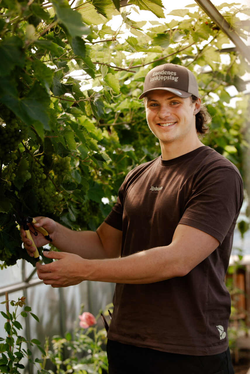 Klassisk trucker-caps i khaki og brun, brodert med Bøndenes Innkjøpslag-logoen.